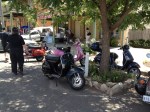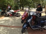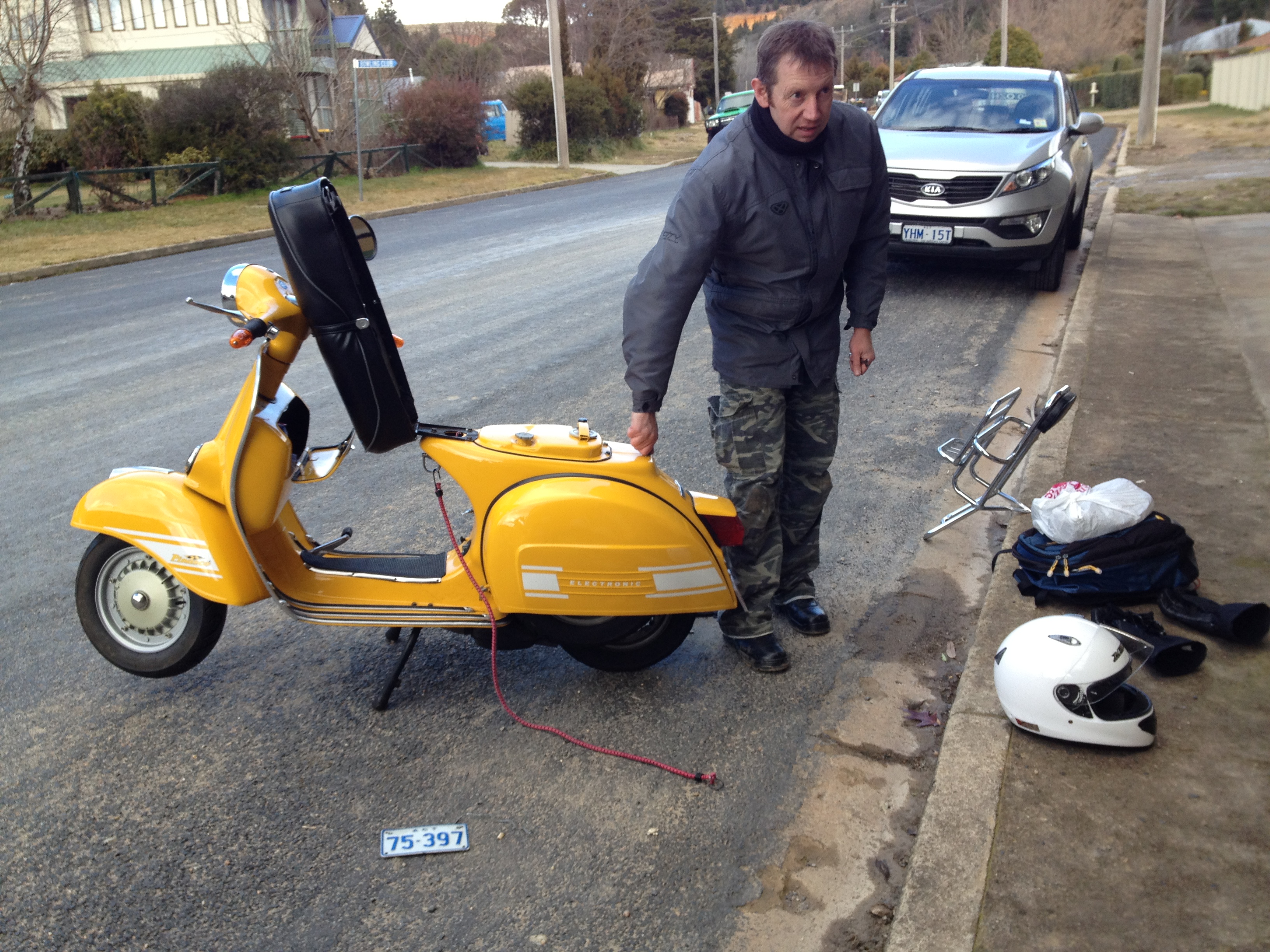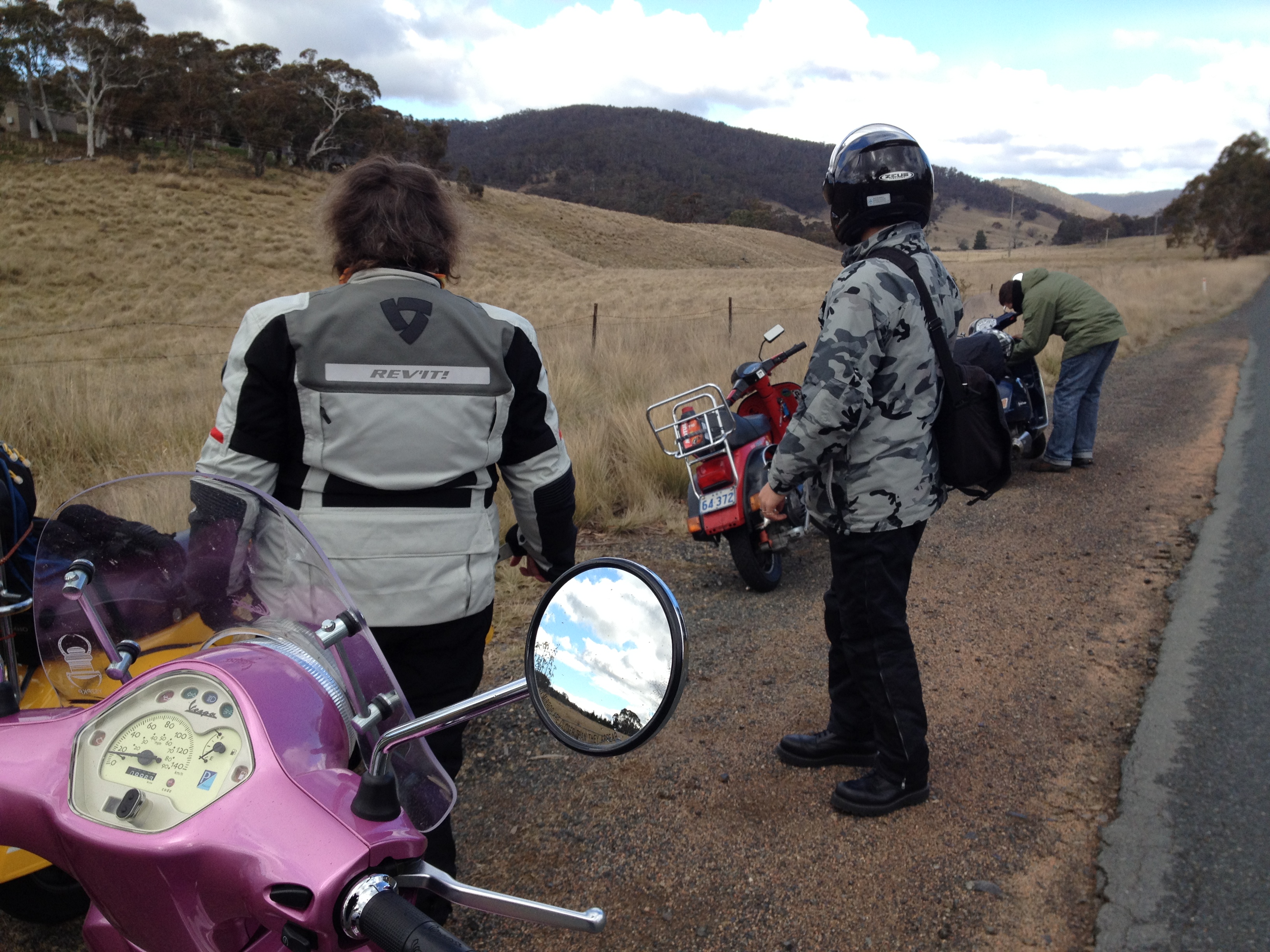 The weather for Sunday’s ride home to Canberra was pretty much perfect. Sun, sun, sun but not hot, hot, hot. A quick diversion had us scooting to nearby Tallong and its idyllic patch of national park overlooking the Shoalhaven River. It seemed like nothing could spoil such a beautiful riding day. Enter the Monkey Bike. Monkey Bike is Bruce’s seemingly indestructible ’63 VBA. Nikki reported hearing some loud pops early in the ride home but he still seemed to be scooting along just fine. I had decided to ride ahead to take on some corners I’m fond of only to be caught by Nikki later on with the report that Monkey was in trouble. Reluctance to start, go and keep going. That’s my technical explanation anyway. We decided to ride on to Tarago and await the arrival of the rest of the group. We were actually pretty confident that all would be fine. Chris, Steve and Bruce have plenty of two-stroke knowledge between them. After we had downed a coke, hidden a geocache and chatted to some passers-by, it was getting obvious that all was not fine. I jumped back onto Giorgio and headed off in the direction we had come. I found the group only five minutes up the road standing around Monkey Bike scratching their heads. No matter how much he was coaxed he refused to start.