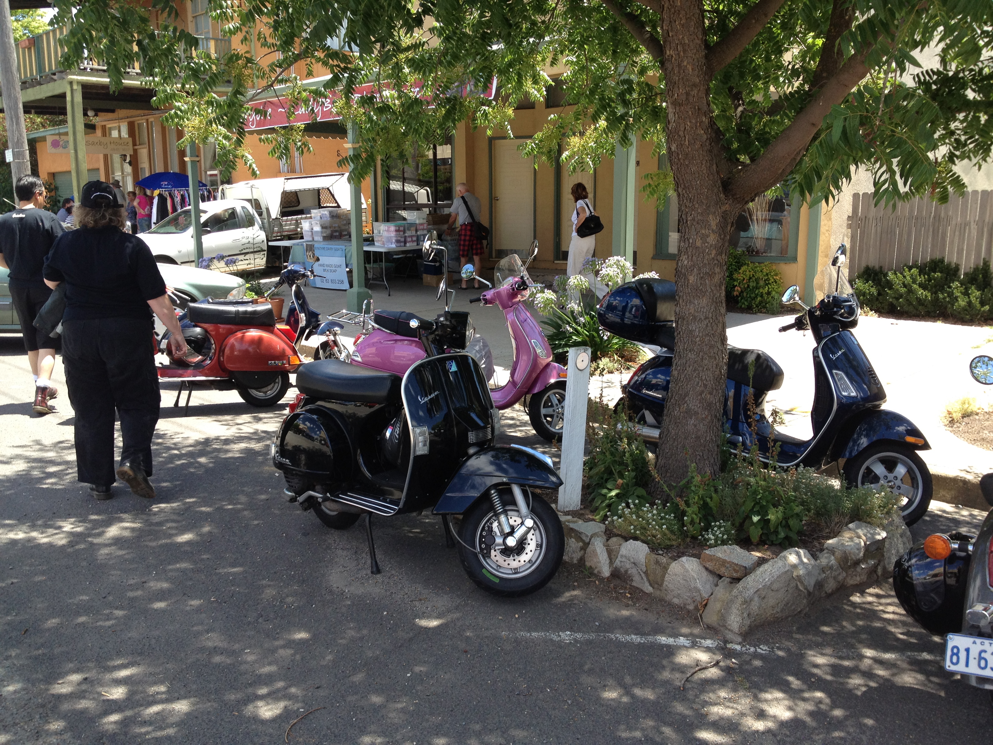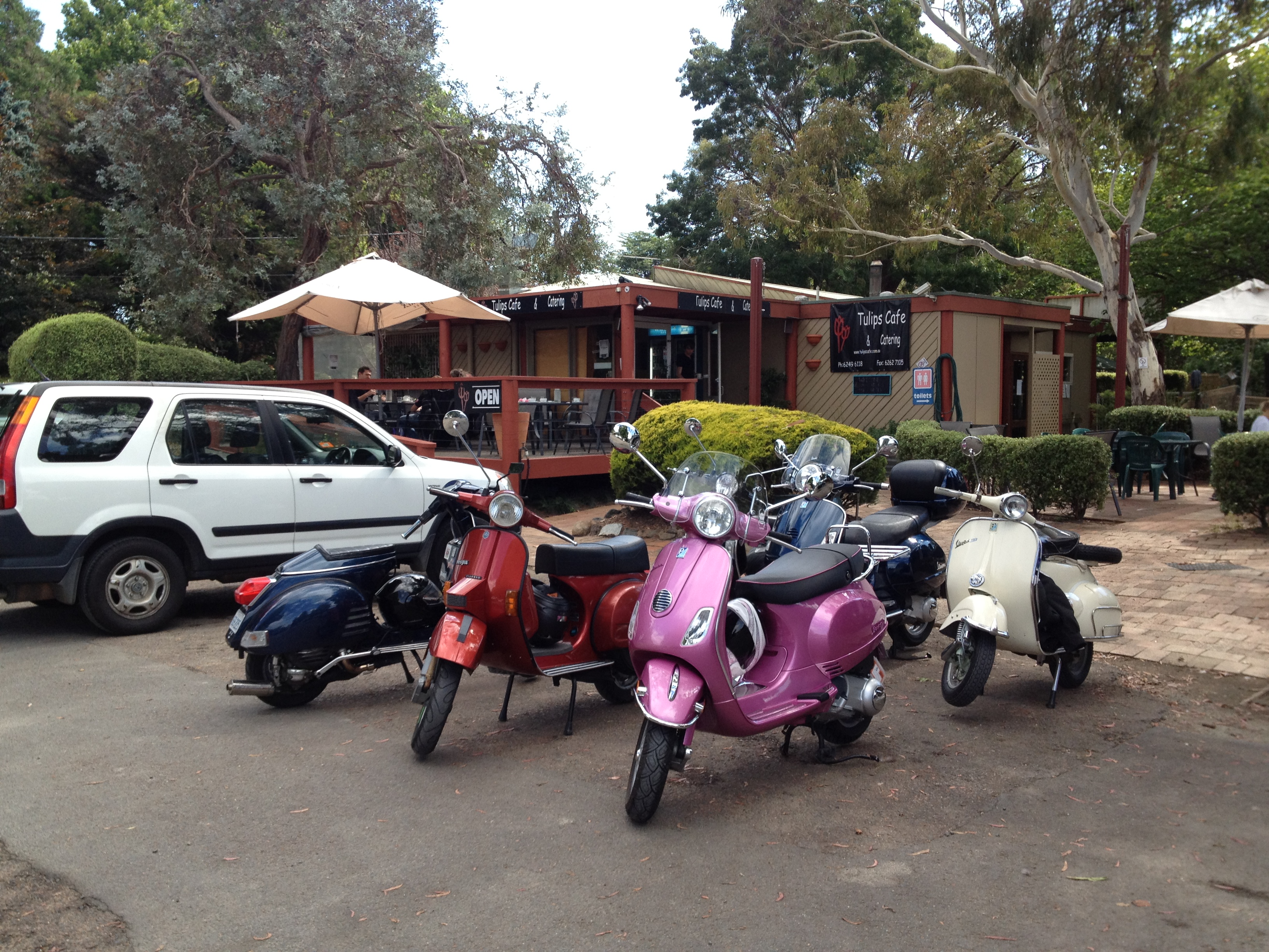 Was I dribbling about some wind or something? It was windy and uncomfortably so. Vespas are light and when it starts to get blowy, riding gets less and less fun because so much energy is spent just staying in a straight line. Add to this our route through eucalypt lined roads, which keeps your eyes constantly scanning for falling branches, and it makes for some unhappy scooting. But whatever – it’s scooting so it’s fun!